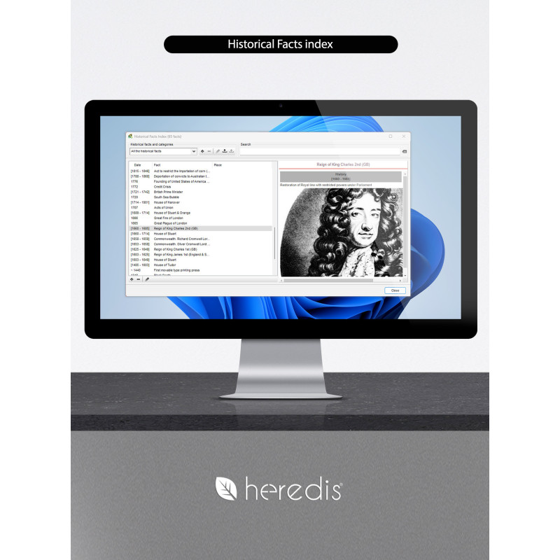 📚 Enriched historical context: the historical facts index places each event in its proper era. You can also create your own historical facts based on where your ancestors lived.